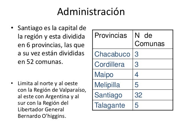 Administración• santiago es la capital de la región y esta dividida provincias n de en 6 provincias, las que comunas a su vez están divididas.